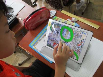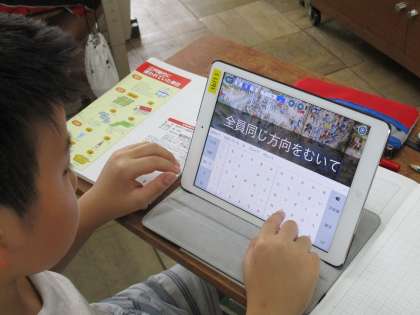 今日は,社会の学習でタブレットを使いました。「3人の武将と天下統一」の単元の導入で,長篠の戦いの屏風絵を子どもたちに送信し,その絵の中に気付いたことを書き込みました。人物を○で囲んだり,武器を服装などに注目してメモをしたり,それぞれが気付いたことを工夫してまとめることができました。