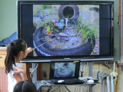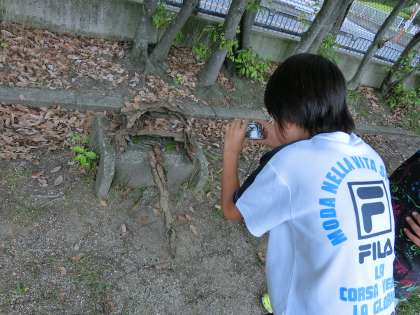 運動場の隅で,自然にある材料を生かした「小さな生き物のすみか」を制作しました。虫,小人,妖精…。様々な小さな住人を想像し,見つけた自然の素材を使って,思い思いのすみかを作りました。