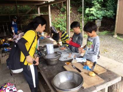 かまどの火をおこし,材料の下ごしらえを進めています。