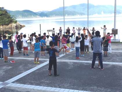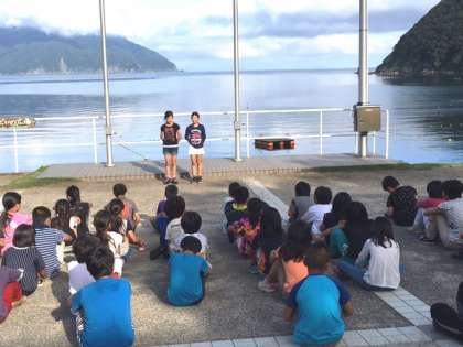 今日の朝のつどいは,本校と向島二の丸小学校の2校で行いました。