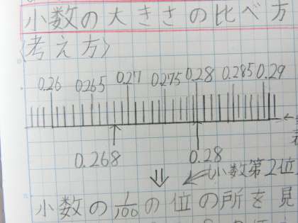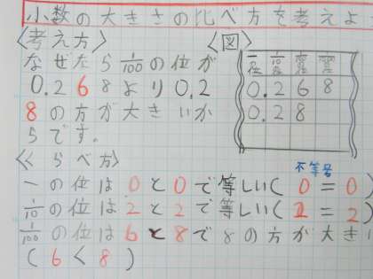 算数科では,小数の学習をしています。今日は小数の大小を比べる方法を考えました。みんなそれぞれ自分の考えをノートに書き,伝え合いました。