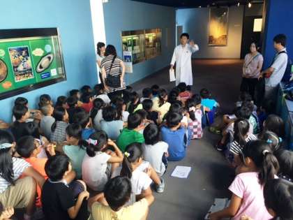 プラネタリウムに入る前に説明を聞いています。