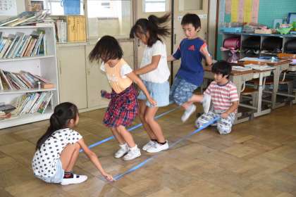 3拍子の「いるかはざんぶらこ」のリズムに合わせてバンブーダンスをゴム紐でしました。いろいろなステップでしました。3拍子のリズムを体で表現できました。