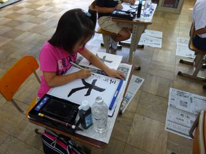 今日は夏休み明けはじめての書写でした。久しぶりの毛筆の感触に嬉しそうな子どもたちでした。「大」の字では,左はらいと右はらいに初めて挑戦しました。難しくて苦戦しながらも集中して取り組みました。