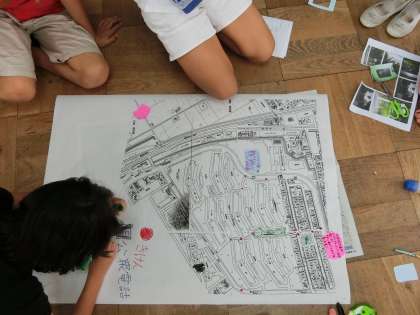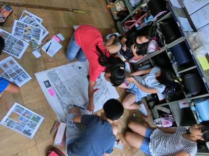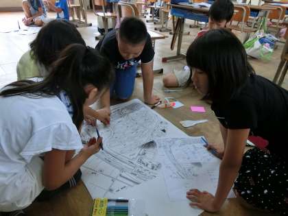 先週のフィールドワークを通して見つけた「校区にある危険な箇所」「事件や事故を防ぐ工夫」を,とってきた写真と共に地図にまとめる活動を,グループで行いました。