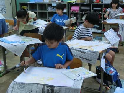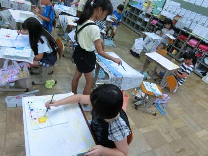 図画工作「大好きな物語」の彩色を始めました。背景の色を考え,色を重ねていきます。「楽しい雰囲気だから,ピンクを中心に。」「月夜の明るさと楽しい踊りの雰囲気で,水色を中心に。」と,気持ちを色にのせていきました。来週は,登場人物を彩色します。