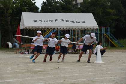 全校競技の「台風の目」では,2年生は全ての組で出場しました。どの組も棒を持つ位置や走り方,そして走るコースを考えていました。2年生も,作戦を理解してがんばっていました。