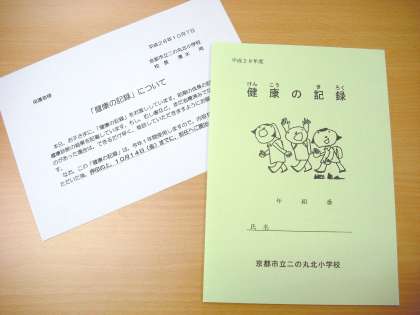 あゆみと一緒にけんこうのきろくをお渡ししています。9月の身体計測結果を新たに追加していますのでご覧ください。またハンコを押して,14日までに学校へ持ってきてください。
