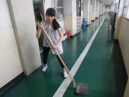 ろうかを,モップで隅々まできれいにする姿