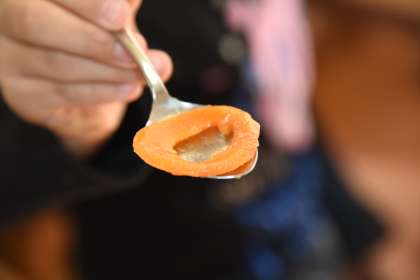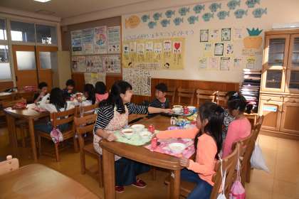 ランチルームで給食を食べました。久しぶりのランチルームでの給食に喜んでいました。ビーフカレーに,魚の形の「幸せニンジン」が入っていたので,さらに喜びました。