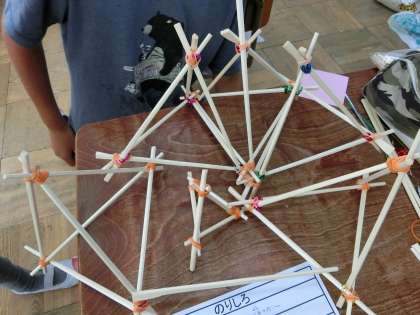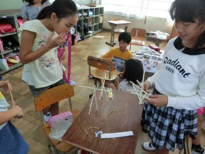 図画工作科「つなぐんぐん」で,わりばしを輪ゴムやモールなどでつないだり,組み合わせたりして面白い形を作りました。