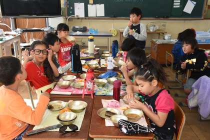 午前中の学習発表会で頑張ったので,給食をより美味しくいただくことができました。鍵谷先生と一緒に食べました。