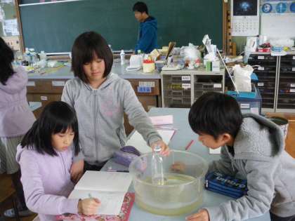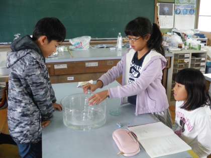 理科で,ペットボトルや試験管に入っている空気を温めたり冷やしたりするとどうなるか,実験しました。目に見えない空気がどうなっているか,絵や図で表しながら,体積が大きくなったり小さくなったりしていることを確かめました。