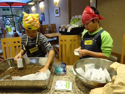 お茶やさんでは,たくさんのお茶っぱを量りではかって25グラムずつパックに詰める仕事を体験しました。お店で飲ませていただいたほうじ茶は甘味があり,とてもおいしかったそうです。