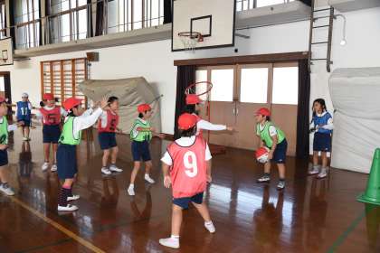 パスゲームの学習をしています。練習が終わり,リーグ戦を始めました。チームで作戦を考えて対戦しました。コートの中を,力一杯動いていました。
