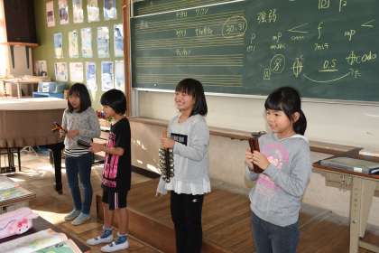 ♪「虫の声」に出てくる虫の声を,楽器を使って表現しました。スズムシや,クツワムシの鳴き声をうまくまねていました。楽器を変えて,いろいろな音で楽しみました。