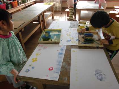 今日は材料をぺったんしたり,ローラーやトイレットペーパーの芯をコロコロしたりして絵を描きました。