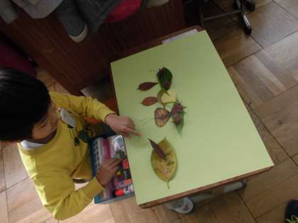 綺麗に色づいたおちばを動物や魚に見立て,楽しい作品が出来上がりました。