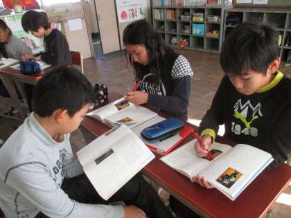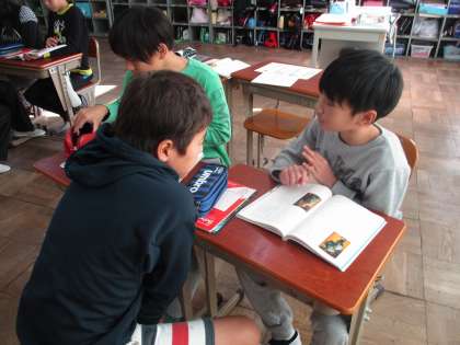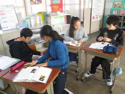 今国語の学習で,狂言の「柿山伏」について学習をしています。昨日は,狂言の特徴を映像やCDを使って,見つけていきました。その後,音読発表会に向けて,班でどちらの人物を演じたいか,どの場面を発表したいのかを話し合いました。子どもたちは,早くやってみたい気持ちを抑えつつ,しっかりと話し合うことができていました。