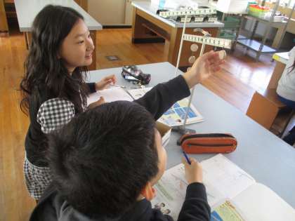 今週の理科は,実験用てこを使って,つり合うときのきまりを見つけました。子どもたちは興味津々で,あっという間にきまりを見つけることができました。また,自分たちで問題を出し合い,きまりを確認していきました。