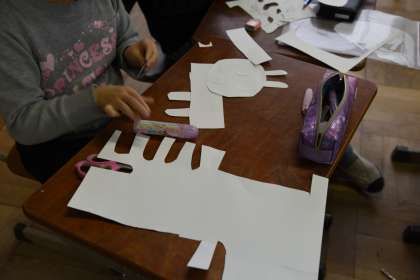 生き物を題材にした,紙版画を作っています。そろそろ形ができてきました。細かい部分を仕上げたら,印刷できます。楽しい版画ができそうです。