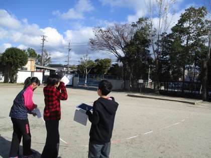 昨日の算数では,ポプラの木や校舎,体育倉庫など,普段測れないものを測るためにどうすればよいかを考えました。1メートル定規や自分の身長の何倍かを比べるとよいという考えからタブレットで写真を撮ったり,教科書の測定器を作って測ったりしながら求めました。どのグループも,協力して行うことができました。ポプラの木は,15メートルから17メートルのものが多かったようです。校舎の高さもポプラの木の高さと似ていたようです。