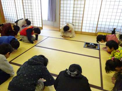 今日は,茶道教室がありました。はじめての人がほとんどでみんな少し緊張しながら挑戦しました。茶道の所作はむずかしかったですが,先生にていねいに教えていただいたのでうまくできました。