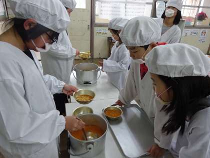 今日の給食はカレーピラフ,トマトスープ,みかん,牛乳でした。毎日,みんなで協力しててきぱき準備しています。