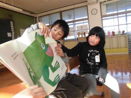 英語を繰り返すだけでも楽しいのに,「次は何だろう?」「ヒントは…」と言いながら,とても楽しく読み聞かせをしてくれました。何度も読んだことのあるみんな大好きな絵本だったので,すらすらと読むことができていました。これからもよろしくお願いします!
