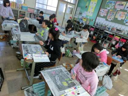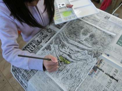 4年生は版画に取り組んでいます。「面彫り」に挑戦し,白黒のバランスを考えて制作しています。刷り上がった作品に色をのせていきます。みんなの集中力が素晴らしいです。
