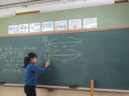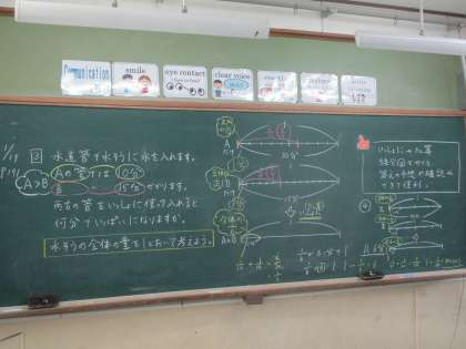今日は,2つの水道管をいっしょに使って,水そうに水を入れる課題に取り組みました。自主勉強で前時の学習をしっかりと振り返っていた子どもがたくさんいたので,自分で線分図をかいて考えられている姿がたくさん見られました。自分にとっての課題をしっかりと見つけて,それを補い,次時の学習に挑む素晴らしい姿でした。