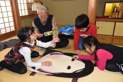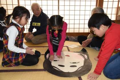 昔の遊びで「福笑い」をしました。目隠しをして顔のパーツを並べるとき,周りから応援の指示が出されます。できた顔を見て喜んでいました。一番笑い声が大きかった福笑いでした。
