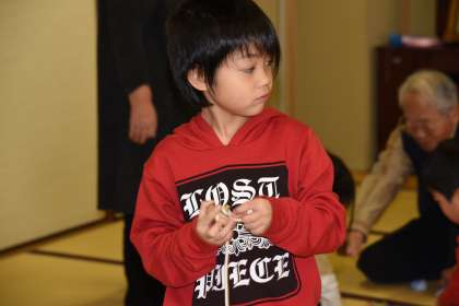 昔の遊びをしました。コマ回しをしました。地域の「楽生会」の人に教えてもらいながらしましたが,なかなかうまく回すことができませんでした。それでも,何回も挑戦していました。