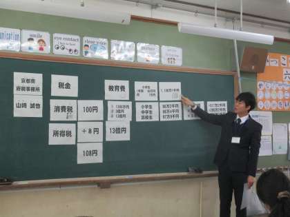 今日は,税の仕組みについて学習しました。今社会でも学習しているところなので,子どもたちは熱心に聞き入り,たくさん発表をすることができました。税金の使われ道を知ることで,税金の大切さを改めて感じることができたようです。