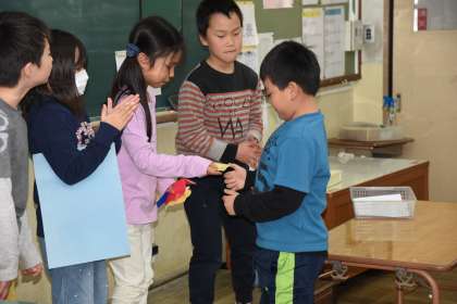 動物クイズ係から出題された問題の採点が終わりました。成績優秀者に記念品が贈られました。記念品は手作りのかわいい折り紙でした。