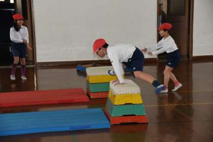体育の時間に跳び箱の練習をしました。ウレタンマットの上に下りる練習や小さな跳び箱を使って跳ぶ練習などをしました。