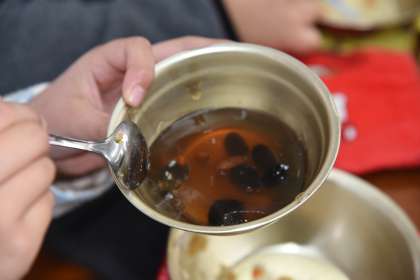 新献立は「黒豆寒天」でした。和風の手作りデザートでした。温かかったのですが,だんだんと冷めてくると固まってきました。おいしくいただきました。