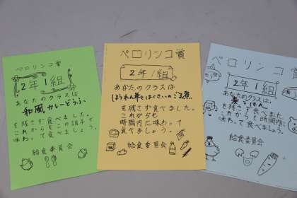2月,唯一のペロリンコ賞の日でした。「和風カレーうどん」「ほうれん草と白菜のゴマ煮」「麦ご飯」の3品を完食しました。これまで数多くあったペロリンコ賞は全部獲得してきました。今年度は,来月にあと1回あります。それも獲得できるようにがんばりましょう。