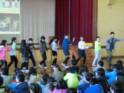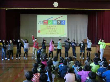 4年生が二の北タイムで「花背山の家」で学んだことを発表しました。キャンプファイヤーの出し物のダンスは,6年生にも協力してもらってにぎやかな雰囲気を再現できました。「楽しかった」ことと「学んだこと」を全校のみんなに伝えることができました。