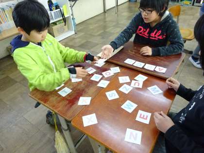 英語活動では,アルファベットに親しむ単元を学習中です。今日は,グループに分かれてカードをアルファベット順にはやくならべるゲームをしたり,集中力ゲームをしました。久しぶりの英語活動でしたが,みんなで楽しんで活動できました。