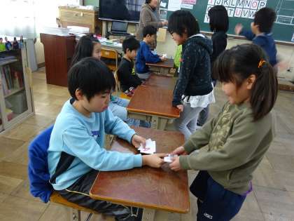 英語活動の後半では,友達とアルファベットカードをもらうやり取りをしました。チャンツでくり返し言っている表現がやり取りで上手に使えました。