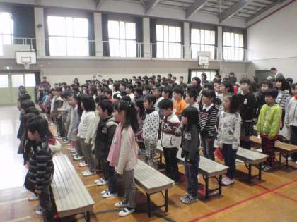 向島二の丸小学校で,4月に行われる統合式の練習をしました。2年生もがんばりました。みんなで言う,統合式児童の言葉の2年生の部分もしっかり言えました。
