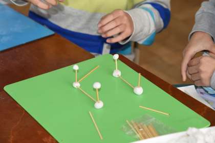 9cm,6cm,4cmの竹ひごを4本ずつと,粘土を使って箱の形を作りました。頂点の数や辺の数が見ただけで分かりました。直角に作るのが難しいようでした。