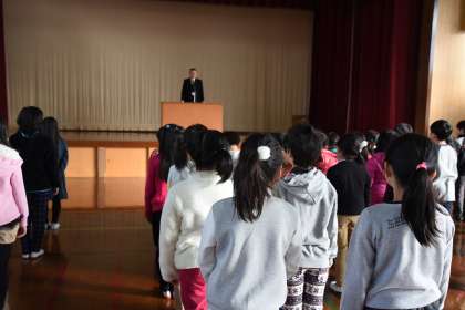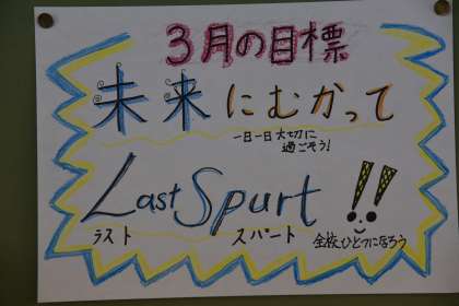 3月の朝会がありました。最後の朝会は,空気が静まるように,物音のしない時間でした。児童会から3月の目標が示されました。「未来に向かって,ラストスパート」です。