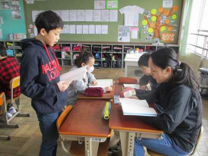 国語では,谷川俊太郎さんの「生きる」という詩の音読をしました。読みこむうちに,子どもたちは好きな連ができ,それぞれで表現の工夫を考えて読みました。最初と最後では,それぞれちがう工夫があり,よりよい読み方を見つけることができました。