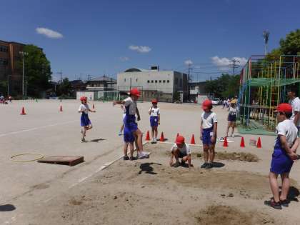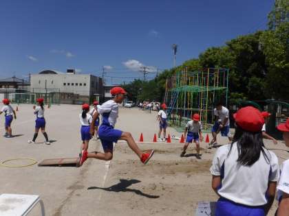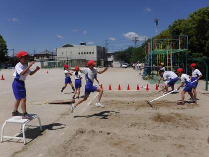 体育で「幅跳び」を学習しています。自分の記録を伸していくために,助走の距離や跳び方,着地の仕方を工夫しながら,熱心に取り組んでいました。