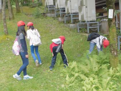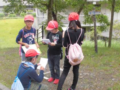 ネイチャービンゴは、「鳥の声」や「さわると痛い木」「こけ」「バッタ」「いい匂い」「つるつるした石」など、山の家の敷地内を回り自然に関するものを探す活動です。