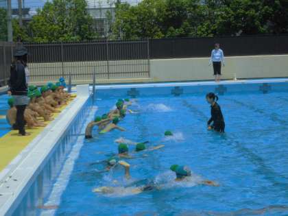 今日は陽射しがあり,気温も上がっています。子どもたちは,気持ち良さそうに泳ぐ練習をしていました。