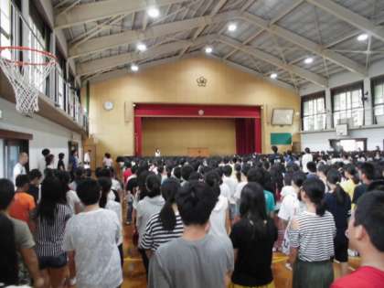 「グッドモーニング!」みなさんの元気な声が学校にもどってきました。大きな荷物を手に汗をかきながら登校してきた子ども達。一時間目は,全校朝会で校長先生のお話を聞きました。部活動で頑張った子ども達の表彰も行いました。