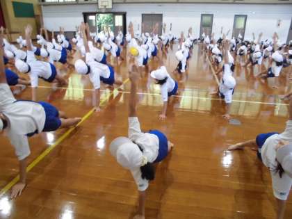 それぞれの交流学級でもがんばっています。1年生は,花笠音頭や短距離走に必死に取り組んでおり,6年生は組体操で技を磨く毎日が続いています。
